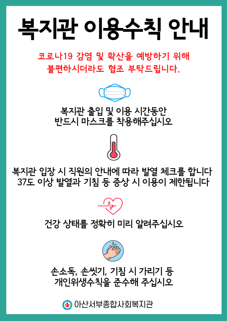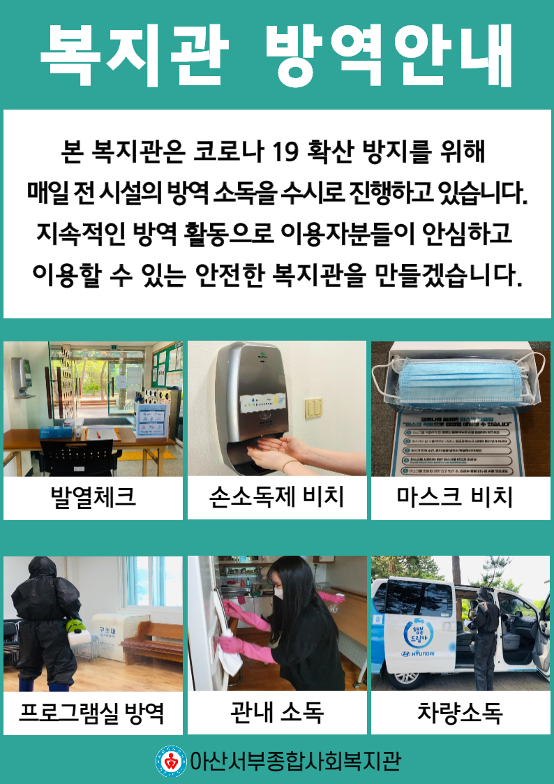 안전한 복지관을 만들기 위해 방역활동과 환경조성에 힘쓰고 있습니다.