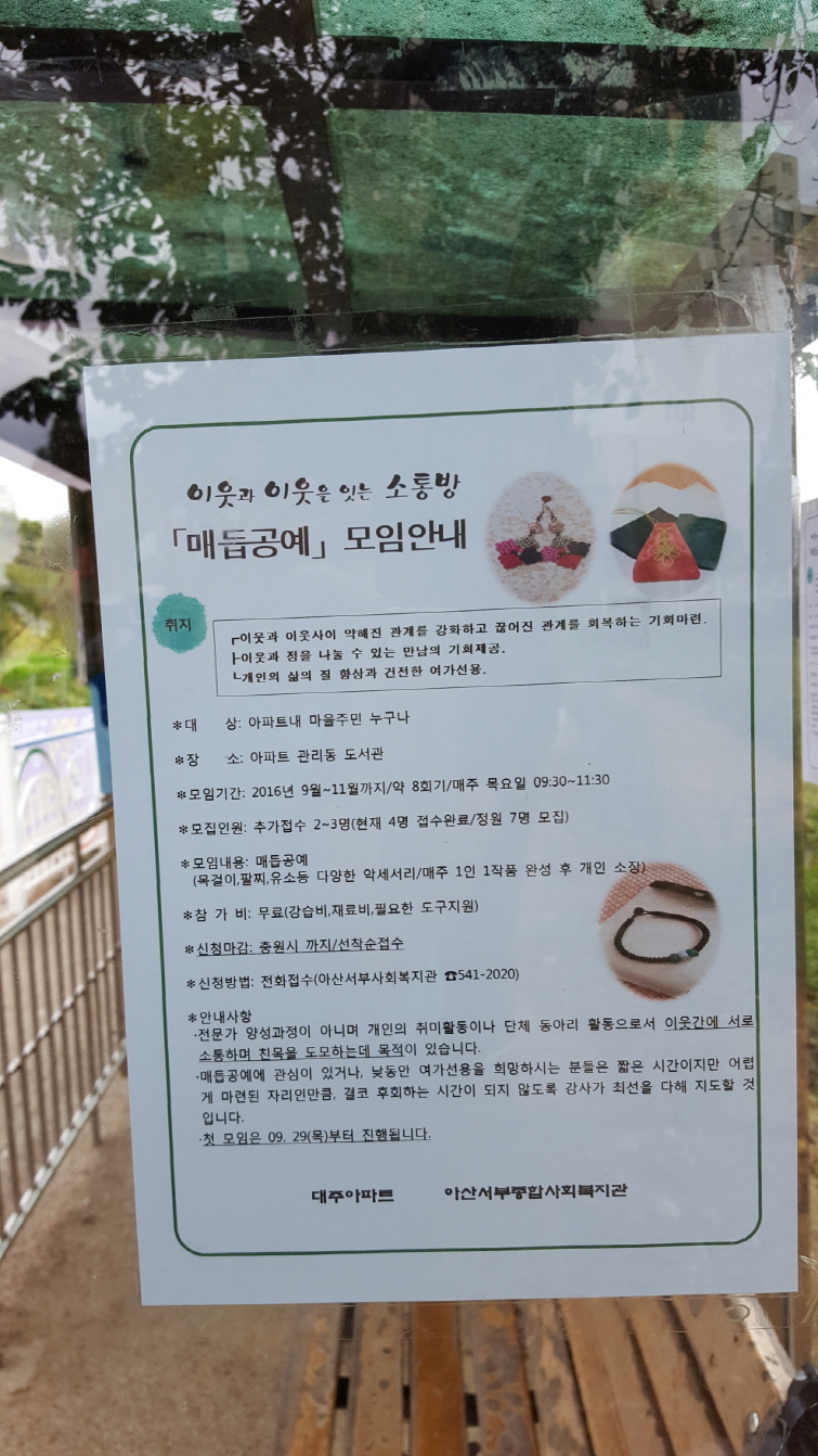 마을만들기 소통방(자조모임)-매듭공예 페이지 정보 작성자 댓글 0건 조회 2,546회 작성일 16-09-29 16:34 본문 2016.09.29(목)/마을만들기 소통방(자조모임)/매듭공예/대주A 목록 답변 이전글베니스/베스트이노베이션 후원품 전달 16.09.29 다음글마을만들기 소통방(자조모임)-제과제빵 16.09.29 댓글목록 댓글목록 등록된 댓글이 없습니다.