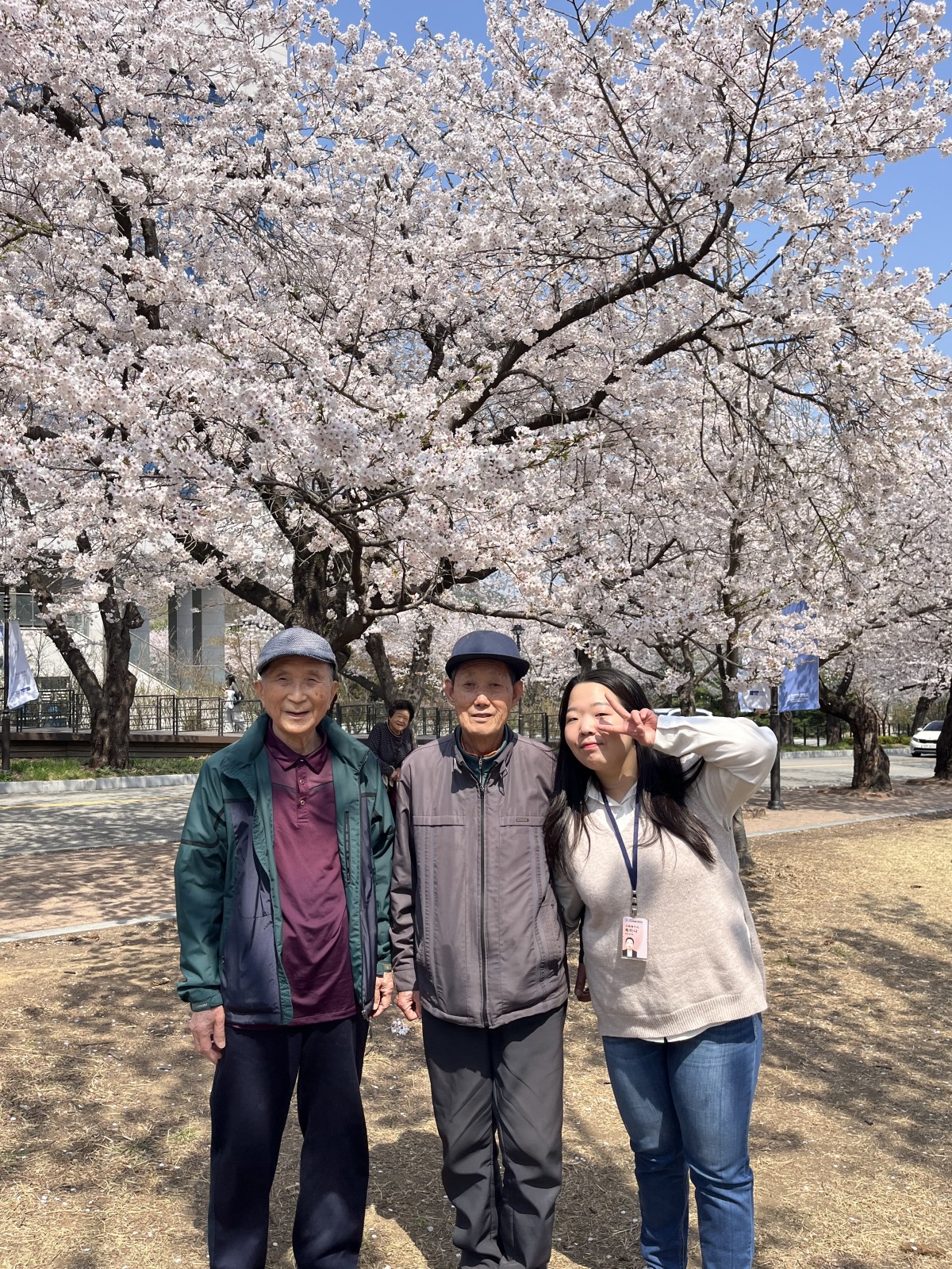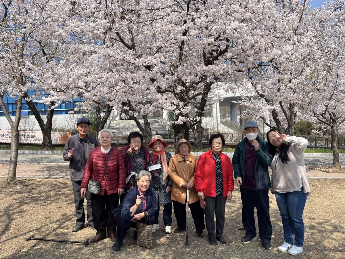 - 내용: 주간보호/노인일자리 어르신들을 모시고 순천향대학교에 방문하여 만개한 벚꽃을 즐기는 시간을 가졌습니다. 벚꽃도 구경하고 함께 사진도 찍고, 봄내음을 느끼며 행복한 시간을 가졌습니다. 활동 마무리로 찍은 사진을 인화하여 어르신들에게 제공드렸더니 매우 만족하셨고, 다음 나들이에 대한 기대감을 보이셨습니다. 앞으로 아산서부종합사회복지관은 어르신들의 건강과 행복을 위해 노력하겠습니다. 감사합니다 :D