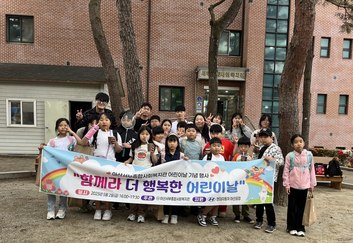 2025년 아동성장학습 어린이날 행사 '함께라 더 행복한 어린이날' 진행 페이지 정보 작성자최고관리자 댓글 0건 조회 520회 작성일 25-05-02 17:30 본문 일자 : 2025. 05. 02. (금)장소 : 아산서부종합사회복지관 소나무밭 외내용 : 레크레이션 활동, 감사편지 쓰기, 부스 운영 및 간식 제공 외지원 : 현대자동차 아산공장 지원 목록 답변 이전글2025 찾아가는 이동복지관사업 노인돌봄프로그램「건강체조교실」 시작 25.05.12 다음글1인가구 지원사업 현충사 산책 25.04.17 댓글목록 댓글목록 등록된 댓글이 없습니다.