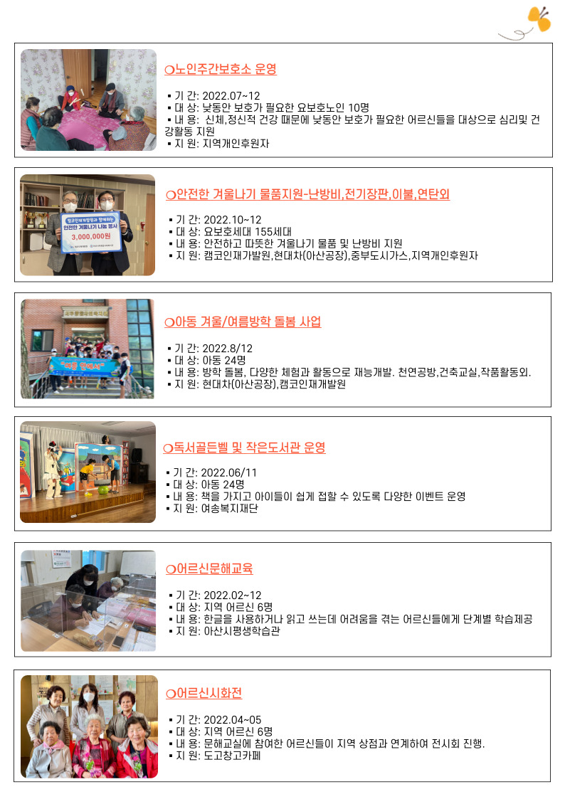 2022년 사업보고서 페이지 정보 작성자 댓글 0건 조회 1,119회 작성일 23-01-11 13:38 본문 2022년 사업보고서 목록 답변 이전글옹달샘(42호) 23.09.22 다음글옹달샘(41호) 22.04.21 댓글목록 댓글목록 등록된 댓글이 없습니다.