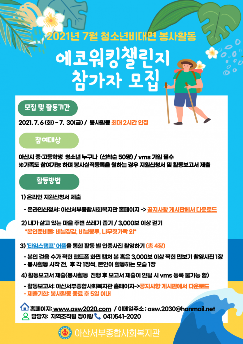 2021년 7월 청소년비대면봉사활동 참가자 모집 페이지 정보 작성자 최고관리자 작성일 21-07-06 13:42 조회 6,026회 댓글 0건 본문 2021년 7월 청소년비대면봉사활동 참가자 모집 이전글제16회 청소년자원봉사체험학교 참가자 모집 (신청서 포함) 다음글2021년 사회복지실습생 선정자(합격) 안내 목록 답변 댓글목록 0 댓글목록 등록된 댓글이 없습니다.