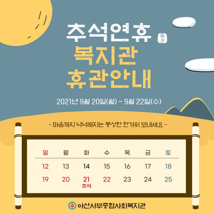 추석연휴 휴관안내 페이지 정보 작성자 최고관리자 작성일 21-09-17 18:42 조회 2,245회 댓글 0건 본문 - 이전글2021 종사자 (사회복지사-계약직) 채용 공고 다음글추석맞이 댓글이벤트! 목록 답변 댓글목록 0 댓글목록 등록된 댓글이 없습니다.