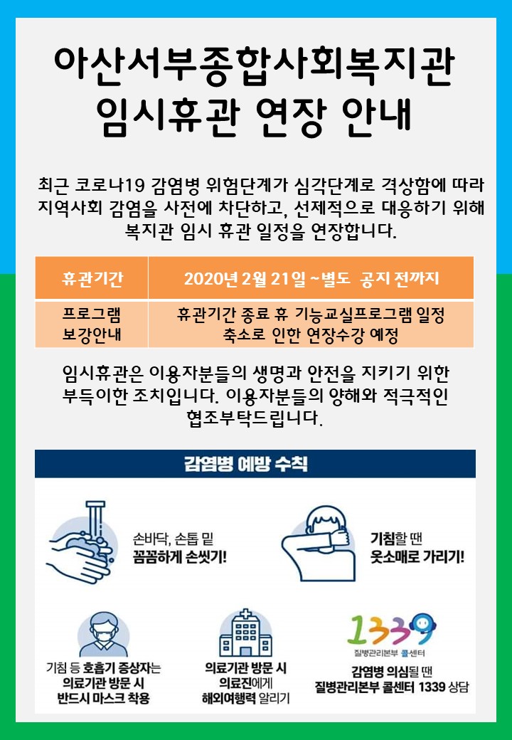 코로나-19바이러스로 인한 복지관 휴관기간 연장 안내 페이지 정보 작성자 최고관리자 작성일 20-04-03 15:03 조회 4,018회 댓글 0건 본문 . 이전글직원인권 및 권리보장 간담회 결과 보고 다음글종사자(사례관리사-계약직) 채용 공고 목록 답변 댓글목록 0 댓글목록 등록된 댓글이 없습니다.