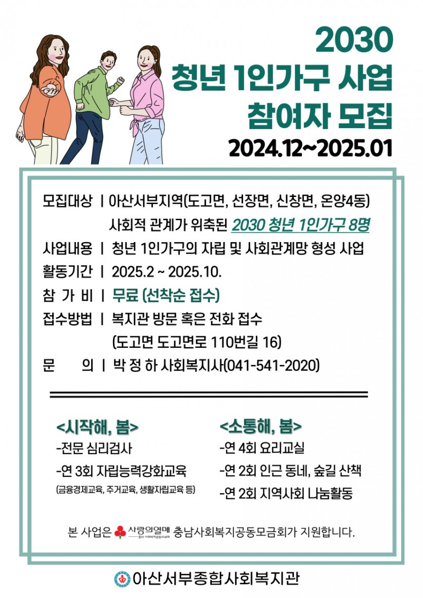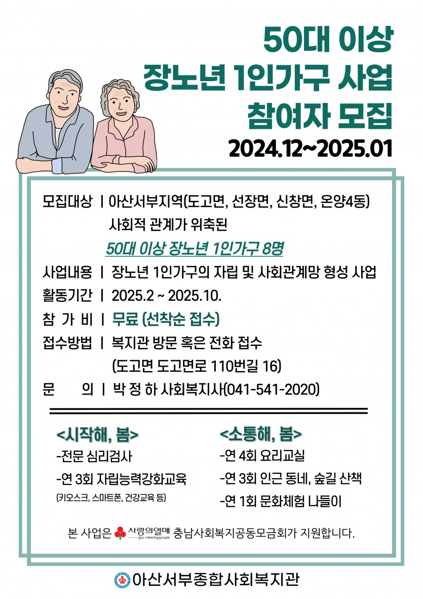 장노년&청년 1인가구 사업 참여자 모집 페이지 정보 작성자 최고관리자 작성일 25-01-31 13:34 조회 568회 댓글 0건 본문 주변 소외된 이웃을 찾아 알려주세요! 이전글2025년 종사자(사례관리사-계약직) 채용 재공고 다음글설 연휴 휴관 안내 목록 답변 댓글목록 0 댓글목록 등록된 댓글이 없습니다.