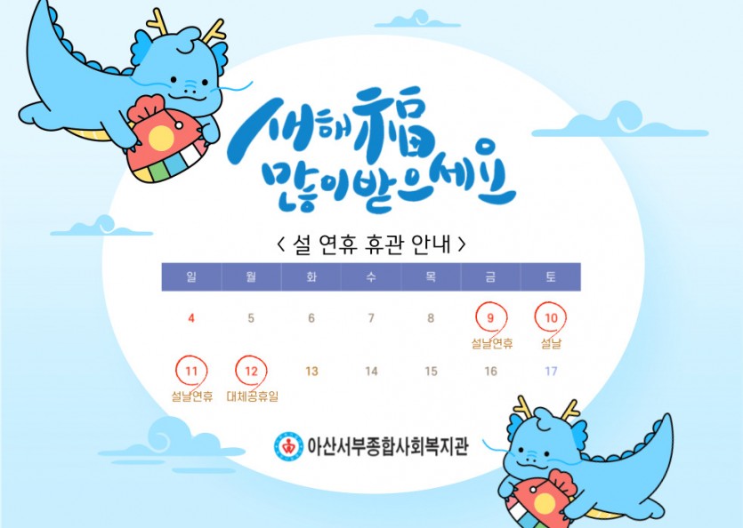 설 연휴 휴관 안내 페이지 정보 작성자 최고관리자 작성일 24-02-08 15:54 조회 1,015회 댓글 0건 본문 2월 9일(금)~2월 12일(월) 복지관 휴관하오니 이용에 불편함이 없으시도록 참고 부탁드립니다. 새해 복 많이 받으시고, 가정에 평안이 깃들기를 바랍니다❤ 이전글2024년 종사자(사회복지사-정규직/계약직) 1차 서류합격자 발표 다음글2024 종사자(사회복지사-계약직) 채용 재공고 목록 답변 댓글목록 0 댓글목록 등록된 댓글이 없습니다.
