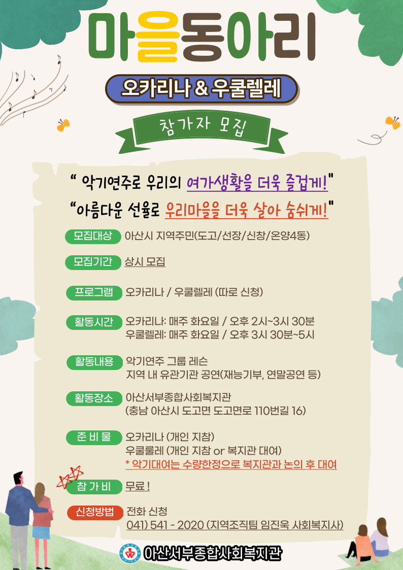 마을동아리 오카리나&우쿨렐레 참가자 모집 페이지 정보 작성자 최고관리자 작성일 23-05-22 11:47 조회 1,241회 댓글 0건 본문 마을동아리 오카리나&우쿨렐레 참가자 모집 이전글2023 하계방학 사회복지실습 참가자 모집 다음글아산시 양성평등기금 지원사업 양성(兩性) 맞춤 미식회 참가자 모집 목록 답변 댓글목록 0 댓글목록 등록된 댓글이 없습니다.